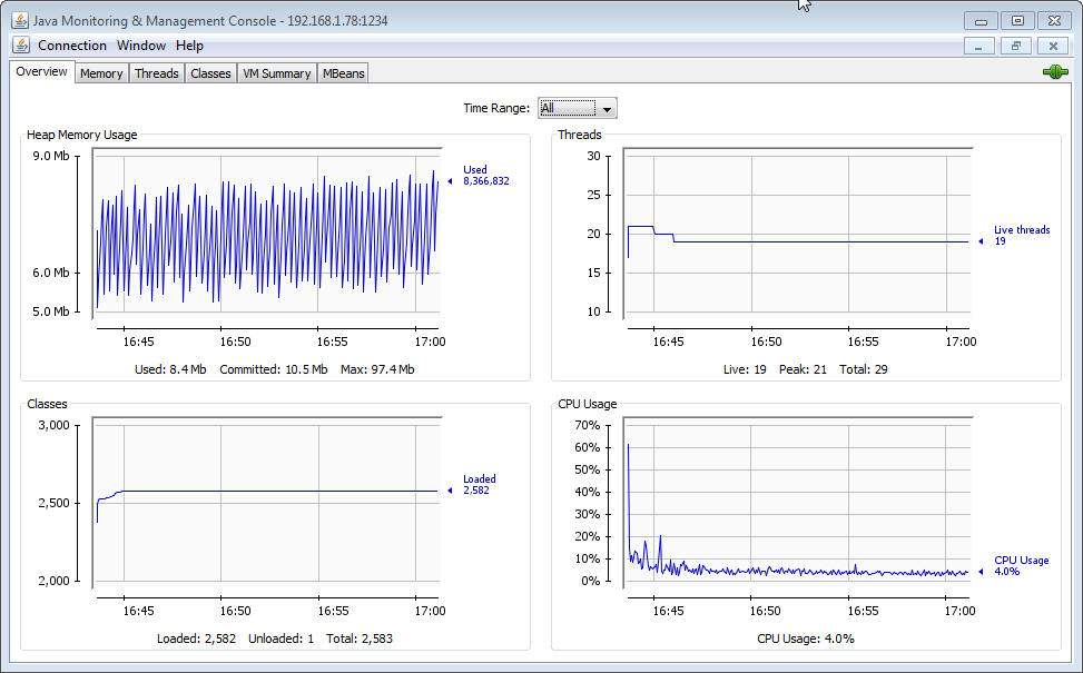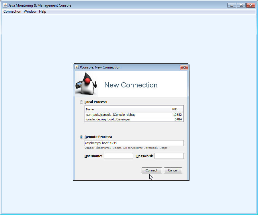 JAVA_OPTIONS="$JAVA_OPTIONS -Dcom.sun.management.jmxremote.port=1234 \ -Dcom.sun.management.jmxremote.ssl=false \ -Dcom.sun.management.jmxremote.authenticate=false \ -Djava.rmi.server.hostname=raspberrypi-boat"The port and the hostname need to match your environment, of course.