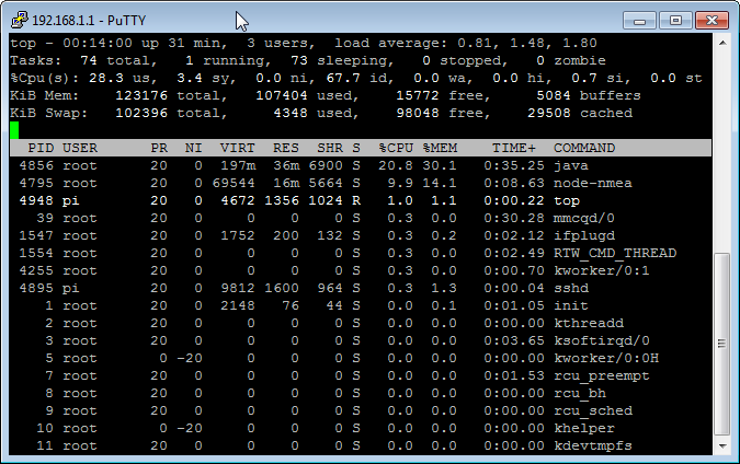 running on the Raspberry PI A+, with all the features above running, including the WebSocket server (nodejs).